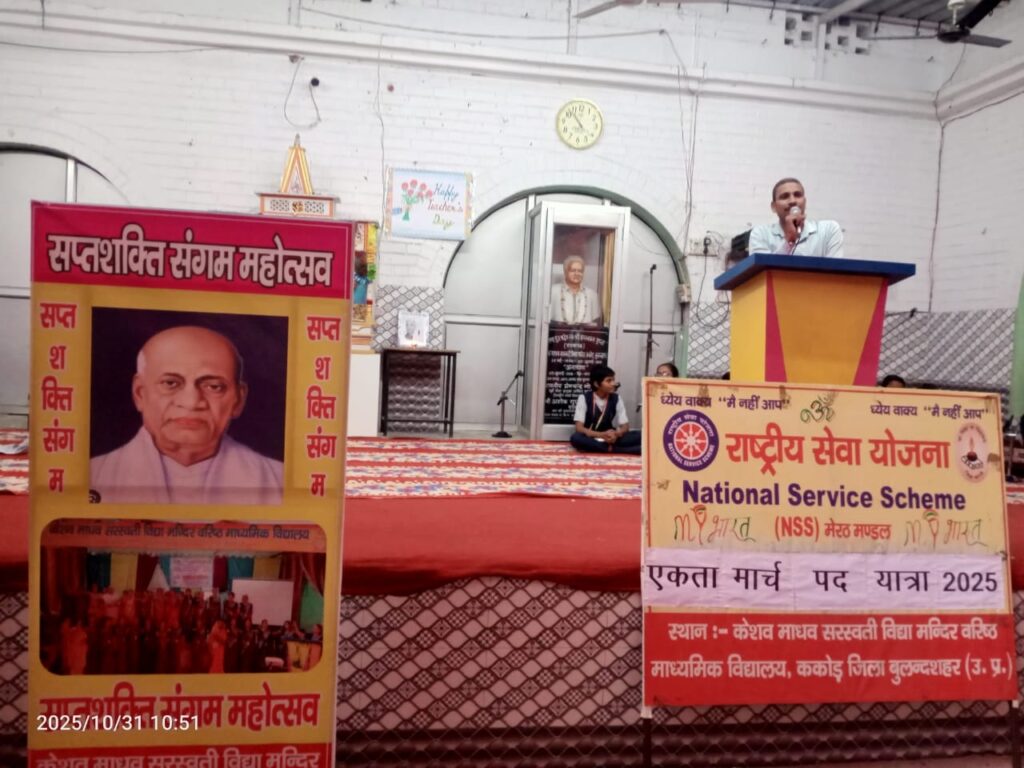 दिनांक 31 अक्टूबर 2025 को राष्ट्रीय सेवा योजना के तत्वाधान में केशव माधव सरस्वती विद्या मंदिर वरिष्ठ माध्यमिक विद्यालय ककोड़ में भारत के पहले उप-प्रधानमंत्री ‘लौहपुरुष’ सरदार वल्लभ भाई पटेल जी की 150वीं जयंती का कार्यक्रम ‘एकता दिवस’ के रूप में मनाया गया। इस कार्यक्रम में राष्ट्रीय सेवा योजना के कार्यक्रम अधिकारी श्रीकृष्ण शर्मा द्वारा कार्यक्रम की रूपरेखा तैयार की गई। 99 स्वयंसेवक एवं स्वयंसेविकाओं द्वारा भाग लिया गया। विद्यालय के कक्षा 11 व 12 के सभी विद्यार्थी भी इसमें सम्मिलित हुए।समस्त कार्यक्रम के अध्यक्ष विद्यालय के प्रधानाचार्य श्री मनोज कुमार मिश्र जी एवं मुख्य वक्ता आचार्य श्री रोहित त्यागी जी रहे।कार्यक्रम का शुभारंभ दीप प्रज्ज्वलन एवं पुष्पार्चन के साथ हुआ। मुख्य वक्ता आचार्य श्री रोहित त्यागी जी ने बताया कि प्रधानमंत्री नरेंद्र मोदी ने सरदार पटेल की याद में 31 अक्टूबर को राष्ट्रीय एकता दिवस के रूप में घोषित किया और इस दिन को 2014 से एकता दिवस के रूप में हर साल मनाया जा रहा है।आज के इस कार्यक्रम में विद्यालय के भैया बहनों ने सरदार वल्लभभाई पटेल जी के जीवन पर प्रकाश डाला। विद्यालय के अध्यक्ष श्री अशोक गुप्ता जी ने कहा कि हर नागरिक की यह मुख्य जिम्मेदारी है कि वह महसूस करे कि उसका देश स्वतंत्र है और अपने स्वतंत्रता देश की रक्षा करना उसका कर्तव्य है।विद्यालय के कोषाध्यक्ष श्री दिनेश सिंघल जी ने बताया कि आज हमें ऊंच-नीच, अमीर-गरीब, जाति-पंथ के भेदभावों को समाप्त कर देना चाहिए तभी हम एक उन्नत देश की कल्पना कर सकते हैं।विद्यालय के प्रबंधक श्री जगदीश प्रसाद ढौंडियाल जी ने कहा भारत की एकता और अखंडता के प्रतीक,आधुनिक भारत के शिल्पकार,महान स्वतंत्रता सेनानी व भारत रत्न,लौह पुरुष सरदार वल्लभ भाई पटेल जी ने खंड -खंड को जोड़ अखंड राष्ट्र का सृजन किया।उन शिल्पी वल्लभ को सबने,लोहपुरुष कह नमन किया।साथ ही विद्यालय के प्रधानाचार्य श्री मनोज कुमार मिश्र जी ने सभी बच्चों को राष्ट्रीय एकता दिवस पर राष्ट्र की एकता एवं अखंडता की शपथ दिलाई। एकता दिवस के इस अवसर पर विद्यालय के एनएनएस के विद्यार्थियों द्वारा राष्ट्र की एकता के लिए रैली निकाली। रैली को सिकंदराबाद क्षेत्र के विधायक श्री लक्ष्मीराज सिंह जी ने हरी झंडी दिखाकर रवाना किया। रैली का आयोजन विद्यालय के एनएसएस प्रोग्राम ऑफिसर श्रीकिशन शर्मा जी ने किया। रैली में ककोड़ नगर के अध्यक्ष श्री मोहित गुप्ता जी, विद्यालय के प्रधानाचार्य श्री मनोज कुमार मिश्र जी, वरिष्ठ आचार्य श्री संदीप कुमार सोलंकी जी, श्री सुरेश गुप्ता जी, श्री बलबीर शर्मा जी, श्री बनवारी लाल शर्मा जी, श्री उमेश शर्मा जी, श्री अवधेश मीना जी एवं श्री रमेश चंद