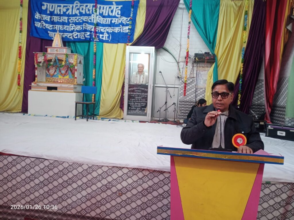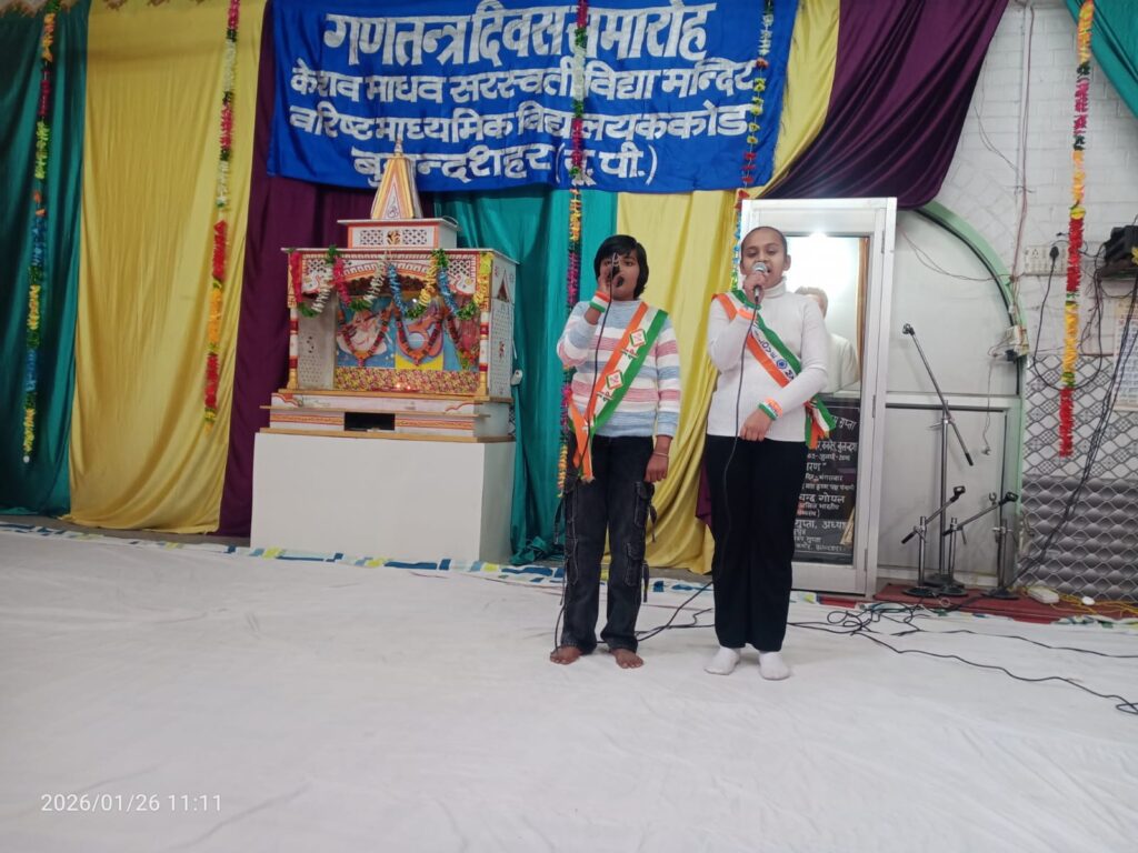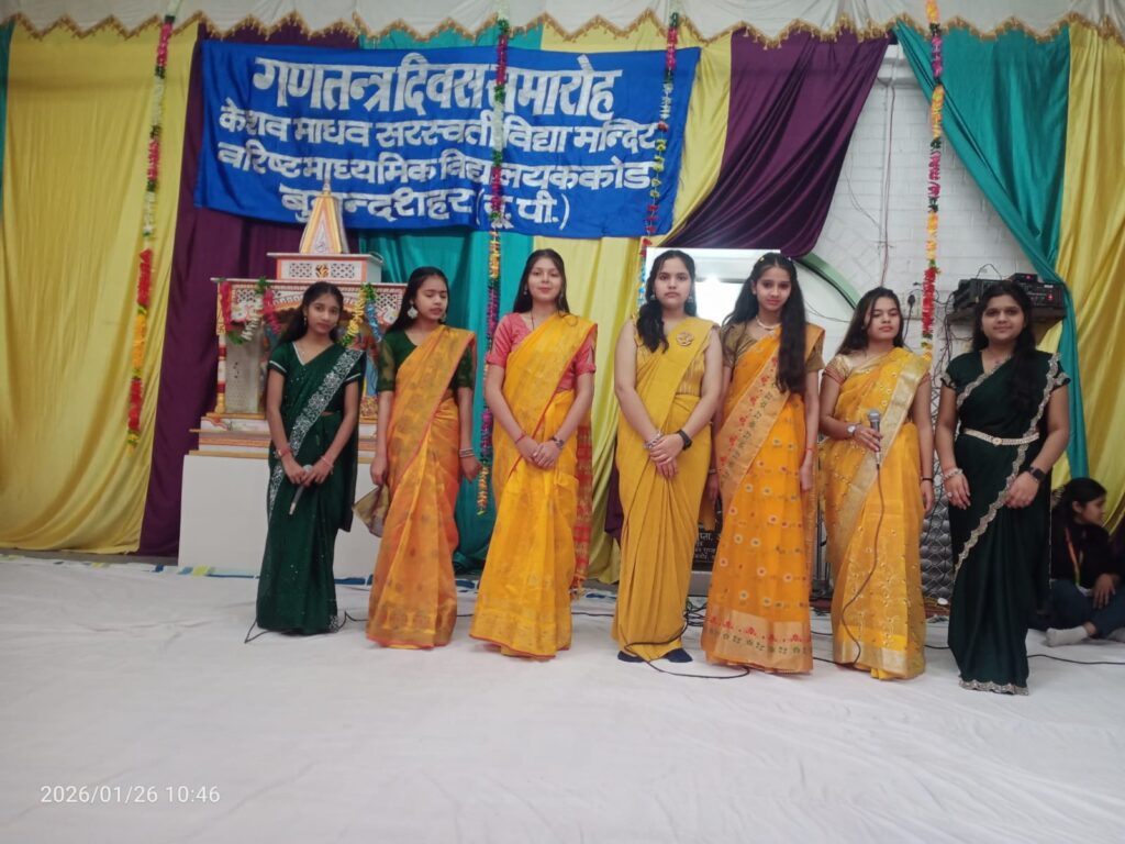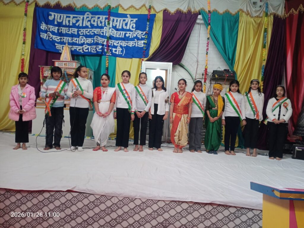 दिनांक 26 जनवरी 2026 को केशव माधव सरस्वती विद्या मंदिर वरिष्ठ माध्यमिक विद्यालय ककोड में 77 वें गणतंत्र दिवस का कार्यक्रम ध्वजारोहण के साथ प्रारंभ हुआ।गणतंत्र दिवस के इस कार्यक्रम में कस्बा ककोड़ के समाजसेवी श्री रमेश बिंदल की मुख्य अतिथि रहे।ध्वजारोहण मुख्य अतिथि श्री रमेश बिंदल जी, विद्यालय के प्रबंधक श्री जगदीश प्रसाद ढोंडियाल जी, विद्यालय के कोषाध्यक्ष श्री दिनेश सिंघल जी, एवं प्रधानाचार्य श्री मनोज कुमार मिश्र जी द्वारा किया गया।आज के इस ध्वजारोहण कार्यक्रम में 39 यूपी बटालियन एनसीसी खुर्जा ग्रुप हेड क्वार्टर अलीगढ़ के एनसीसी कैडेट ने अपने विद्यालय केशव माधव सरस्वती विद्या मंदिर वरिष्ठ माध्यमिक विद्यालय ककोड बुलंदशहर में गणतंत्र दिवस पर फ्लैग होस्टिंग, एनसीसी परेड तथा सांस्कृतिक कार्यक्रम में भाग लिया।इस कार्यक्रम में 90 एनसीसी कैडेट ने भाग लिया। लेफ्टिनेंट श्री उमेश कुमार पाण्डेय जी, थर्ड ऑफिसर श्री जितेंद्र सिंह जी तथा जेडब्लू की सीटीओ श्रीमती मनीषा जी उपस्थित रहे।कार्यक्रम के संयोजक वरिष्ठ आचार्य श्री बनवारी लाल शर्मा जी एवं आचार्या बहन चंचल शर्मा जी, रहे। कार्यक्रम का संचालन बहन पलक एवं मुदिता ने किया। गणतंत्र दिवस के सांस्कृतिक कार्यक्रम का आयोजन दीप प्रज्ज्वलन, पुष्पार्चन एवं भारत माता पूजन के साथ बड़े ही हर्षोल्लास एवं उत्साह के साथ हुआ।अतिथि परिचय विद्यालय के प्रधानाचार्य श्री मनोज कुमार मिश्र जी द्वारा कराया गया।विद्यालय के आचार्य सागर डागुर जी के नेतृत्व में भैया बहनों ने सेल्फ डिफेंस से संबंधित साहसिक एवं योग कार्यक्रम प्रस्तुत किया। कार्यक्रम में विद्यालय के छात्र एवं छात्राओं ने स्वतंत्रता संग्राम में बलिदान होने वाले शहीदों को याद करते हुए स्वागत गीत, देशभक्ति गीत, भाषण, सामूहिक गीत, नाटक, झलकियां, योग आकृतियां एवं देशभक्ति नृत्य प्रस्तुत किए।विद्यालय की राष्ट्रीय सेवा योजना इकाई द्वारा बालिका शिक्षा के प्रोत्साहन हेतु नाटक प्रस्तुत किया गया। विद्यालय की एनएसएस विंग के समस्त भैया- बहन, एनसीसी व स्काउट एवं गाइड के समस्त भैया – बहनों ने ध्वज सलामी दी तथा कार्यक्रम में सहयोग किया। गणतंत्र दिवस के अवसर पर विद्यालय के प्रबंधक श्री जगदीश प्रसाद ढौंडियाल जी ने सभी छात्र एवं छात्राओं को देशभक्ति से ओतप्रोत होने का संकल्प दिलाया जिससे देश को भ्रष्टाचार एवं आतंकवाद से आजादी दिलाई जा सके।विद्यालय के अध्यक्ष श्री अशोक गुप्ता जी ने सभी क्षेत्रवासियों को गणतंत्र दिवस की शुभकामनाएं दीं। मुख्य अतिथि उद्बोधन समाजसेवी श्री रमेश बिंदल जी द्वारा दिया गया।कार्यक्रम के अंत में धन्यवाद ज्ञापन विद्यालय के प्रधानाचार्य श्री मनोज कुमार म
